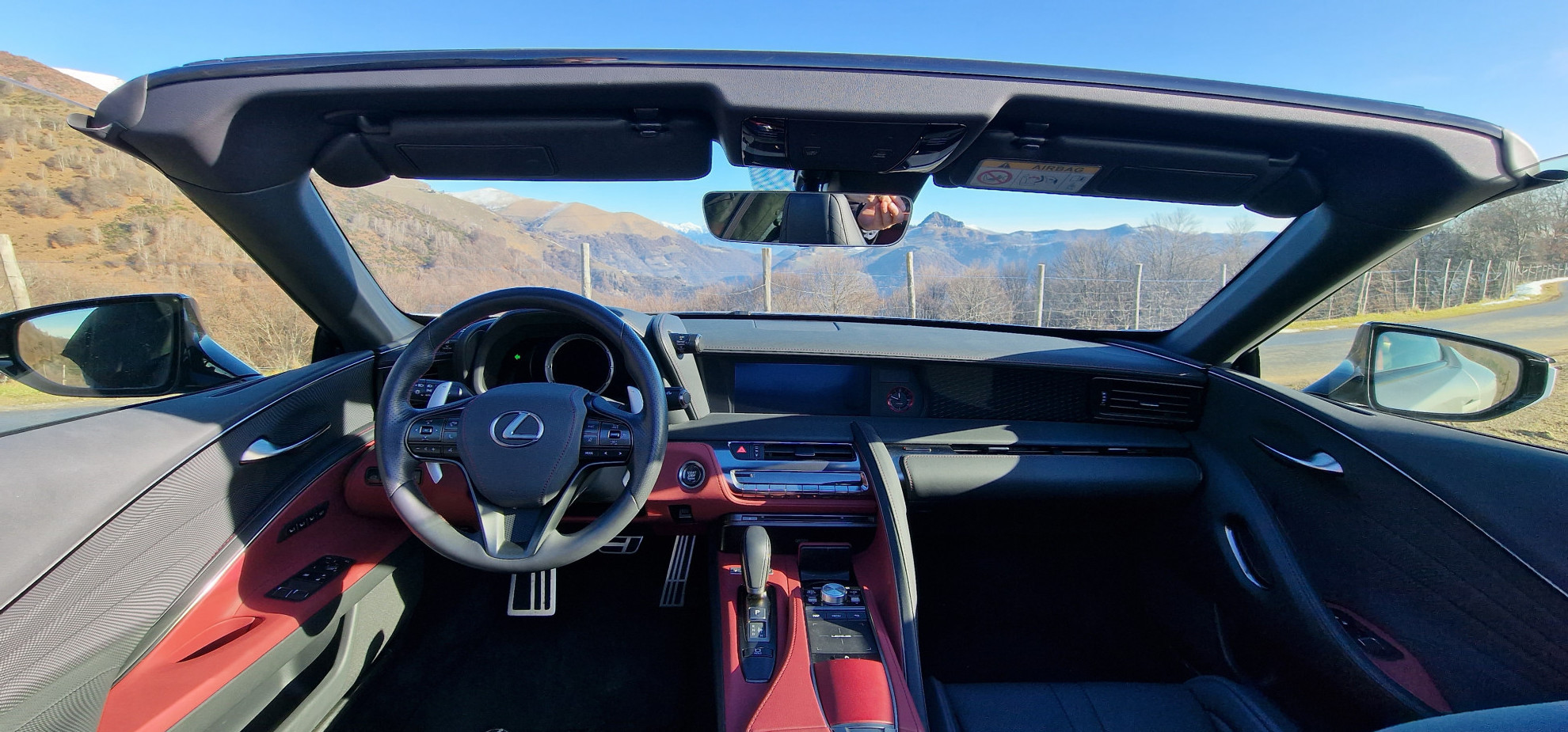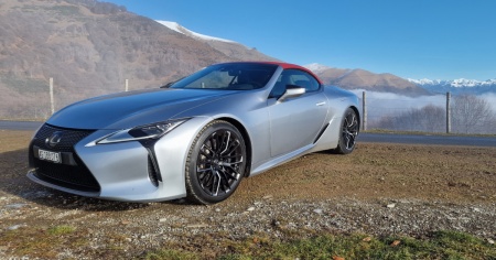 Arrivo al concessionario e la vedo in bella vista parcheggiata a lato della strada cantonale e sembra dirmi "Eccomi qui". La osservo per qualche istante e mi accorgo che è lunga, molto lunga rispetto a una qualsiasi altra cabrio in circolazione. Il cofano è allungato e mi sembra di vedere una delle vecchie Corvette con i musi interminabili. Ma questa è una Lexus e dopo tutto le dimensioni la rendono esteticamente molto interessante. La apro con il telecomando e la maniglia a scomparsa esce. Apro la portiera ed entro con un po' di fatica perché è bassa, molto bassa. All'interno il lusso la fa da padrone, la pelle rossa e nera è molto confortevole al tatto. Bella e soprattutto confortevole. L'abitacolo è molto spazioso per conducente e passeggero, il sedile è decisamente comodo. Dò un'occhiata dietro e sorrido... Forse due persone molto piccole potrebbero starci, ma come detto questo bolide non è fatto per una famiglia ma per una coppia a cui piace il lusso, la potenza e la comodità. La accendo con il tasto che si trova sulla destra del volante e il rombo si fa sentire. WOW! Premo leggermente sull'acceleratore e il V8 benzina ci dona un sound strepitoso. Parto in modalità Eco per prenderci un po' la mano e percorro come sempre i primi chilometri con questa modalità. Dimostra di avere una guida piuttosto fluida che si addice a una gran turismo, ma non abbastanza brusca da soddisfare il guerriero del fine settimana che c'è in voi. Buona l'insonorizzazione, all'interno i rumori esterni non si sentono e il rombo si fa sentire ma non troppo. Decido di abbassare la capotte in movimento fino a 35 km/h. Meglio, molto meglio, adesso sono pronto per evocare il lato oscuro di questa LC e attivo la modalità Sport S+ che sprigiona tutti i 465 cavalli a disposizione e la irrigidisce mostrando tutta la sua maneggevolezza in qualsiasi situazione. Sembra incollata alla strada ma attenzione alla trazione posteriore! La potenza, il rombo e la maneggevolezza la fanno da padrone. A ogni cambio di marcia lo scarico emette un colpo tipico del V8. Eccezionale. Sia in automatico che sfruttando le palette il cambio di marcia è velocissimo. In curva sembra incollata alla strada ma soprattutto senza capotte il sound è strepitoso.