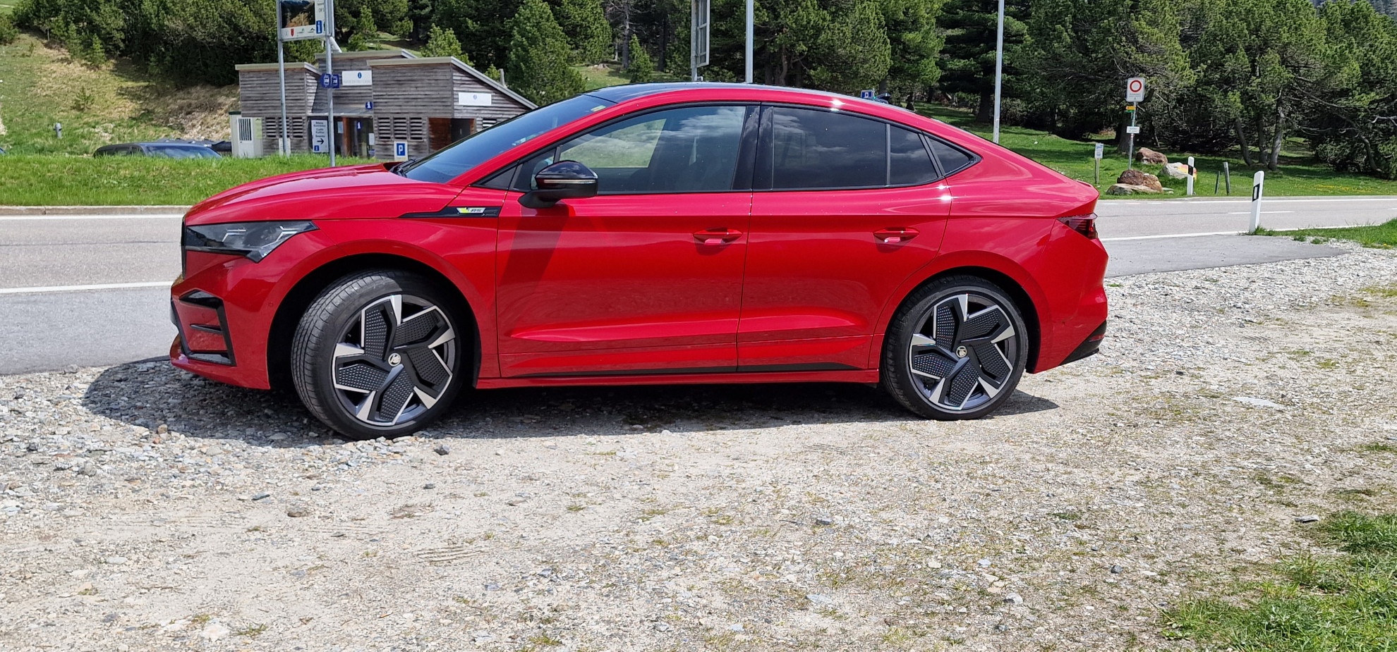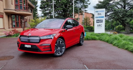 Come va? Come sempre ritiro la Coupè dal concessionario, un rosso intenso, e penso: è il colore adatto a questa vettura elettrica con 299 cavalli in versione Coupé mi piace molto di più rispetto alla versione provata in precedenza perché gli dà quel tocco di sportività in più. Premo il pulsante del telecomando per aprirla e il frontale si illumina con la sua "Crystal Face" composta da 131 LED che illuminano i listelli verticali della calandra. Apro la portiera e osservo i sedili sportivi con la scritta RS e il cruscotto tipicamente Skoda. Gli interni sono curati nei minimi dettagli e la comodità alla guida è molto buona. Ma non perdiamoci in troppe parole, parto in modalità normale per prenderci un po' la mano, Comodi i sedili, alla guida è interessante e nonostante la stazza è maneggevole e rapida nei cambi di direzione e le curve.