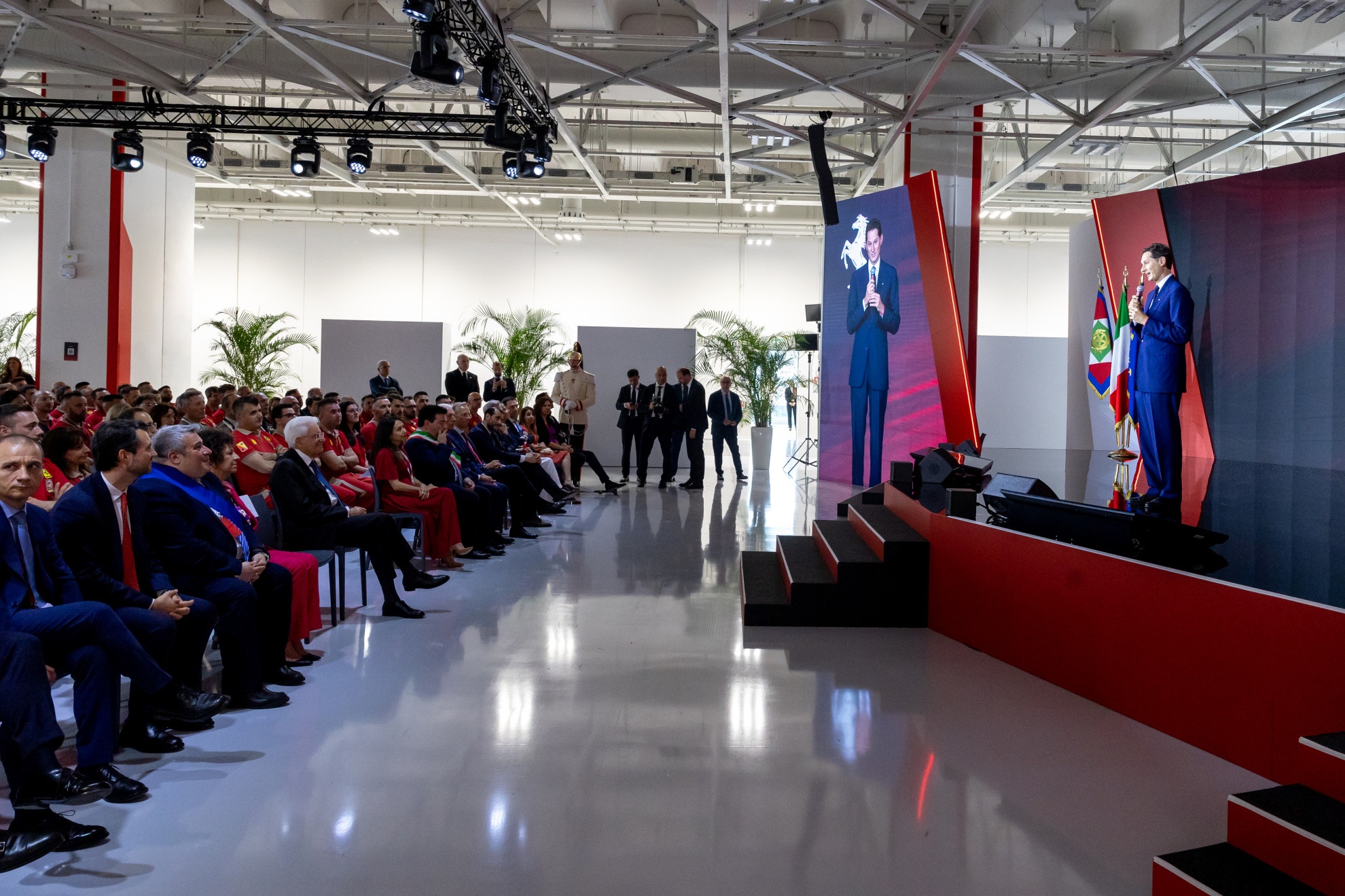 Alla cerimonia di inaugurazione, il Presidente della Repubblica Italiana Sergio Mattarella ha presenziato insieme al Presidente di Ferrari John Elkann, al Vice Presidente Piero Ferrari e all'Amministratore Delegato Benedetto Vigna. Questo evento ha segnato l'inizio di una nuova era per Ferrari, poiché l'e-building sarà il luogo in cui nasceranno vetture con ogni tipo di motorizzazione: termica, ibrida ed elettrica.