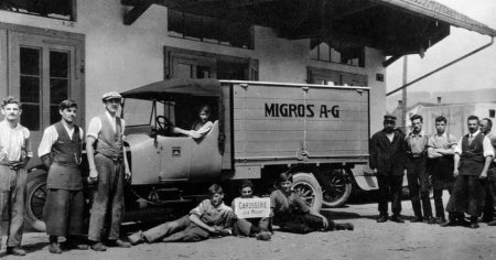 E ora vorrei parlarvi di quell'uomo generoso con idee geniali, che fu Gottlieb Duttweiler. Nel 1925 compaiono in strada cinque camion sgangherati, che portavano alimentari in posti remoti. Poi, negli anni, questo mezzo di vendita viene offerto con una flotta di 144 enormi camion, veri negozi itineranti che arrivano dappertutto.