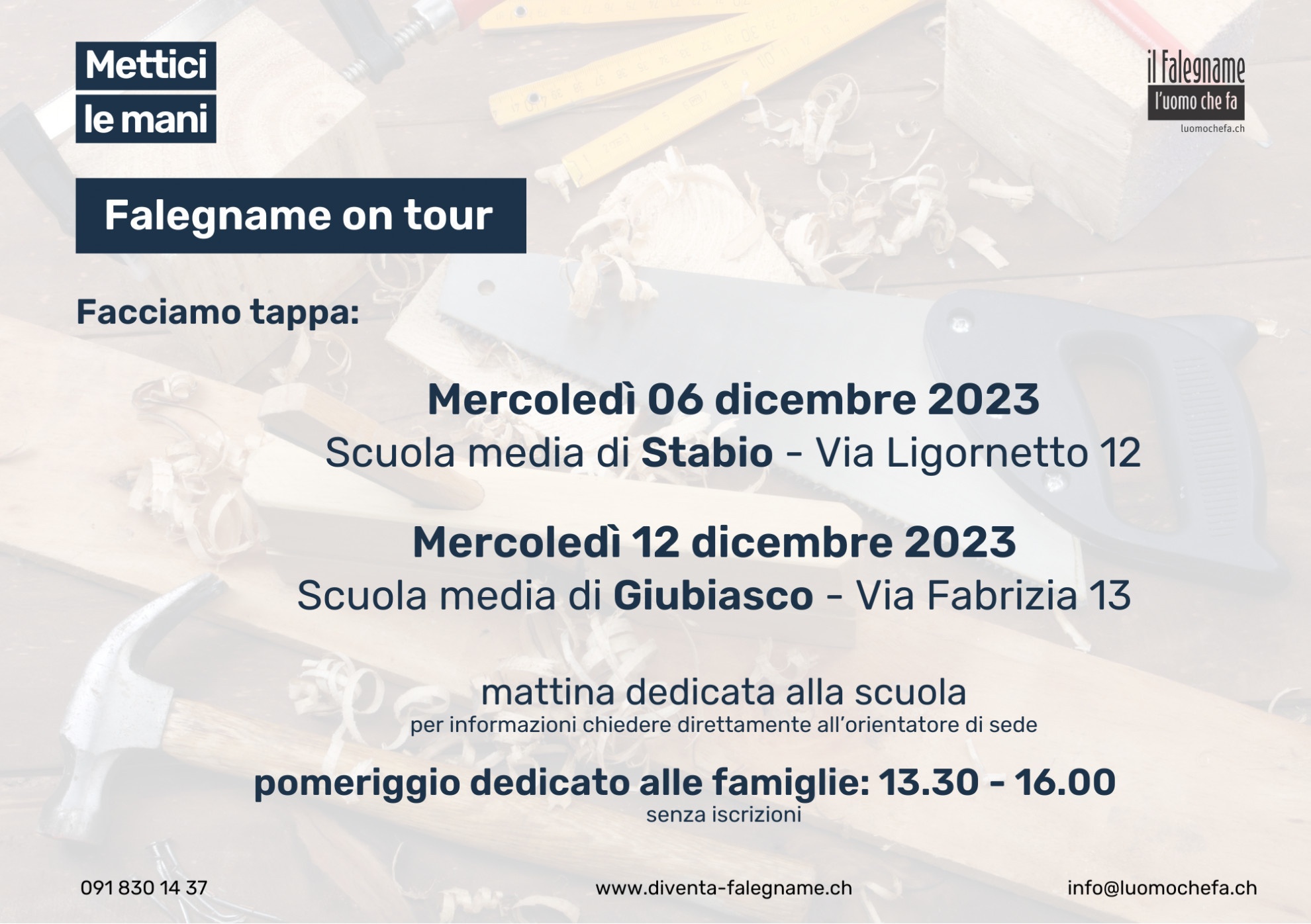 Vuoi scoprire di più e sperimentare in prima persona la professione del Falegname? Nel mese di dicembre il “Falegname on tour” sarà presente nelle scuole medie di Stabio e di Giubiasco. Un’occasione unica per compiere il primo passo verso questa affascinate professione.