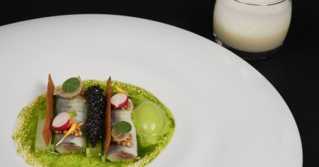 E gli ospiti della serata hanno trovato tutto il suo mondo nei meravigliosi piatti presentati: Sardine bretoni con cetrioli dell’orto di Reichenau, ravanelli, caviale imperiale e panna acidula; Torta di fegato d’anatra con gelato di fegato d’anatra, prugne salate e insalatine amare; Scampo arrosto con fregola sarda, pomodoro di Reichenau, pinoli e zucchine; Lucioperca appena scottato con crauti di finocchio, lasagnetta, salsa e vin jaune; Agnello della fattoria di Poltinger al punto rosa con fagiolini verdi, cipolle di Roscoff, grano saraceno, salsa d’agnello in due modi; Intermezzo rinfrescante con limone e champagne; Dorso di manzetta del Lago di Costanza con zucca butternut, verza e rosa canina e per finire Bacche, Pavlova con vaniglia di Tahiti e nocciole piemontesi.