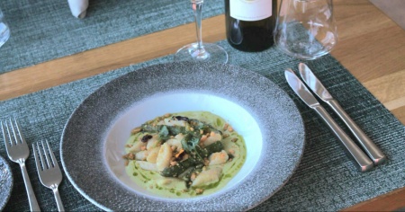Immerso nel cuore del Ticino, nella grande distesa pianeggiante del Piano di Magadino tra i centri urbani di Bellinzona e Locarno, a Sant’Antonino il Ristorante dell’Hotel La Perla offre piatti tipici ticinesi, con un'attenzione particolare alla qualità delle materie prime, rispecchiando un luogo ricco di storia. Oggi il Piano di Magadino non è solo la superficie pianeggiante più estesa del Ticino ma è anche il suo “granaio”. Dall’inizio del XXI secolo, 4/5 della produzione ortofrutticola del Ticino viene prodotta qui e grazie alla collaborazione con l’azienda di famiglia Orticola Bassi, il ristorante offre prodotti del territorio freschissimi preparati dallo Chef Yves Bussi e il suo team. Per Ticino Gourmet, il sous chef Lucas Soldati propone Gnocchetti di polenta bianca agli asparagi abbinati a La Lepre, Cantina alla Maggia, Bianco del Ticino DOC, un assemblaggio fra uve Merlot vinificate in bianco e uve di vitigni aromatici e semi aromatici, una gradevole freschezza ideale per esaltare i sapori del piatto.