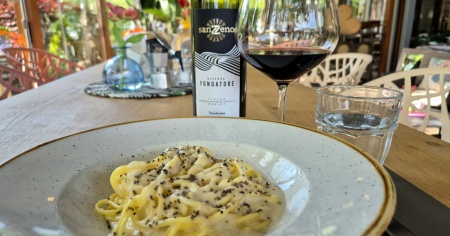 Lo chef Davide Merra prepara per Ticino Gourmet e Tio una ricetta Cacio e Pepe con pepe della Valle Maggia abbinato a SanZeno riserva fondatore, Ticino Doc Riserva, 2021, un Merlot di Tamborini Vini dal carattere speciale, elegante e aristocratico. Intenso, complesso e fruttato, ideale per piatti dal gusto forte.