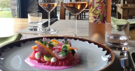 Piatti semplici ma gourmet, eseguiti con cura e attenzione verso le materie prime del territorio come la Trota salmonata marinata alla barbabietola, yogurt e verdure in agrodolce abbinato al 13 Rosé, Rosato di Merlot Ticino DOC, Castello di Morcote. Un vino biologico fresco, delicato ed elegante, ideale per il buon equilibrio tra aromi floreali e fruttati.
