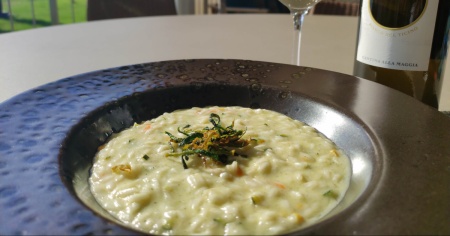 Situato direttamente sul lungolago, con una vista mozzafiato sul Lago Maggiore grazie a una splendida terrazza, il suo ambiente, moderno e accogliente, offre una cucina ricercata con specialità tradizionali e internazionali e un lounge bar raffinato con cocktail classici e innovativi. Per Ticino Gourmet e TIO lo chef Bruno Panico ha preparato Risotto fior di zucca e caciocavallo abbinato a La Lepre, Cantina alla Maggia, Bianco del Ticino DOC, un assemblaggio fra uve Merlot vinificate in bianco e uve di vitigni aromatici e semi aromatico, una gradevole freschezza ideale per esaltare i sapori del piatto.