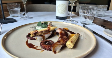 La cucina del 3vie è un sapiente mix di tradizione e innovazione. Gli chef Alessia e Baldo, con la loro creatività, reinterpretano i sapori locali con un tocco contemporaneo, utilizzando ingredienti freschi e di stagione. Per TG e TIO propongono Polpo cotto in infusione di cannella, chiodi di garofano e agrumi, lardo nostrano, salsa ai funghi shitake e maiale, purè di patata dolce, mais e mousse di jalapeño abbinato a Chardonnay Amphora 2022, Chardonnay Ticino DOC, Castello di Morcote, un vino elegante e raffinato ideale con piatti a base di pesce, frutti di mare, carni bianche e formaggi a pasta molle.