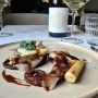 - Fare 3 righe di purè nel piatto, aggiungere i tentacoli con sopra il lardo affettato e versare un po’ di salsa, per finire agitare bene il sifone e fare un punto di spuma in un angolo.
