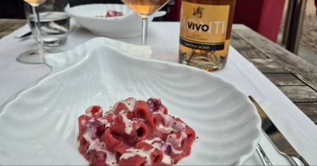 Per TG e TIO, lo chef del ristorante Mary propone Ditalini alla barbabietola e caprino ticinese abbinato a Monti Vivo della Cantina Monti, uno spumante metodo classico rosato, fresco e di lunga persistenza.