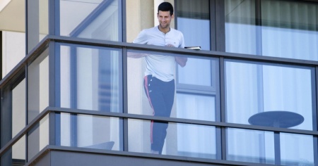 Nella foto Novak Djokovic dal balcone della sua stanza d'albergo.