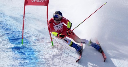 PALISADES TAHOE - Marco Odermatt guarda momentaneamente tutti dall'alto dopo la prima manche del Gigante maschile, in corso di svolgimento sulle nevi statunitensi di Palisades Tahoe.