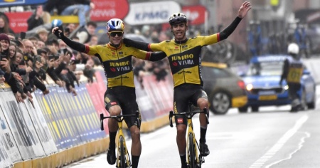 WEVELGEM - L'edizione 2023 della Gand-Wevelgem è stata nel segno della Jumbo-Visma, che ha firmato una splendida doppietta con Wout van Aert e Christophe Laporte, arrivati in solitaria dopo l’attacco decisivo sferrato sul muro del Kemmelberg.