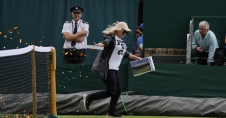 Il 66enne e la 68enne avrebbero deciso di "attaccare" lo slam britannico visto che è sponsorizzato dalla banca Barclays, la quale afferma di aver donato 30 miliardi di sterline alle compagnie petrolifere e del gas nell'ultimo biennio. I combustibili fossili sono infatti un grande emettitore di gas serra e causano il cambiamento climatico. Milner-Edwards si è così seduto in mezzo al campo dopo aver lanciato cartoncini arancioni e una scatola di puzzle raffigurante l'immagine del Campo Centrale. Dal canto suo la Wilde si è messa a correre per il campo con due scatole in mano. L'interruzione è durata qualche minuto, il tempo che gli steward intervenissero per portare via entrambi e per liberare il prato. I due "invasori" sono stati arrestati con l'accusa di violazione di domicilio aggravata e danno penale.