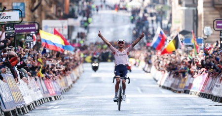 GLASGOW - Un fantastico Mathieu van der Poel si è laureato campione del mondo a Glasgow. Con un attacco prepotente lanciato a 20 km dall’arrivo, l'olandese nato in Belgio ha sbaragliato la concorrenza e si è preso l'oro. È transitato in solitaria sotto lo striscione del traguardo bissando il successo - juniores - iridato centrato a Firenze dieci anni fa. Una medaglia al collo l’hanno messa pure Wout van Aert (+1’37") e Tadej Pogacar (1’45"). Quarto posto per Pedersen (1'45"), quinto per il nostro Stefan Küng (3'48").