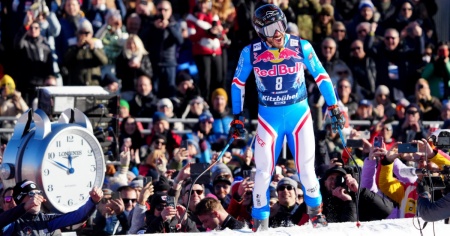 KITZBÜHEL - Il 29enne Cyprien Sarrazin, in stato di grazia e scatenato nei festeggiamenti all’arrivo, ha firmato un sontuoso bis sulla mitica Streif di Kitzbühel.