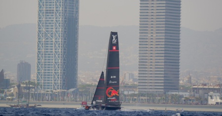 Timonato da Arnaud Psarofaghis e Maxime Bachelin, l'AC75 è partito subito molto forte ed è stato in grado di costruire rapidamente un vantaggio di alcune lunghezze fino a raggiungere 12 secondi di vantaggio alla prima boa. Forti di una velocità di più di 45 nodi (quasi 90 km/h) - più di tre volte della velocità del vento - l'equipaggio elvetico è poi riuscito a controllare il suo avversario di giornata rispondendo colpo su colpo a ciascuno dei suoi attacchi. Dopo 22 minuti e 43 secondi di regata, Alinghi Red Bull Racing ha così ottenuto il suo primo successo ufficiale a questa 37esima edizione della Coppa America.