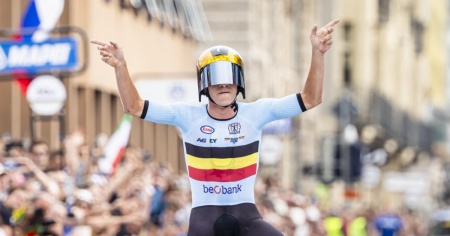 Il belga ha vinto per il secondo anno di fila la prova contro il tempo valida per il Mondiale. Alle sue spalle gli italiani Ganna e Affini