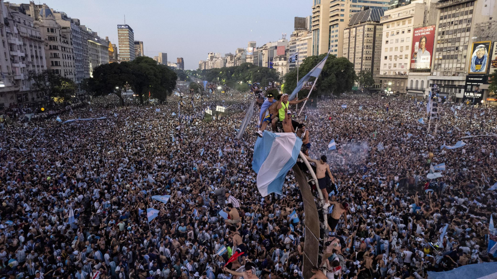 Le immagini che provengono da Buenos Aires ininterrottamente da ieri sera - momento in cui l'Argentina è salita sul tetto del mondo - sono impressionanti. Come si può vedere sia nella fotogallery sia nel video pubblicato su Twitter in allegato, continua la festa che vede coinvolti una marea di tifosi dell'Albiceleste - stimati a più di due milioni - per le strade della Capitale argentina.