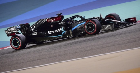 Il britannico scatterà dalla pole nel GP del Bahrain. Rosse in sesta fila