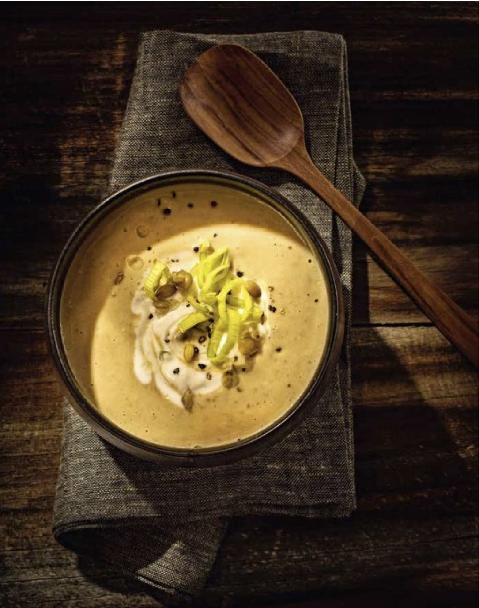 Aggiungere l’alternativa alla panna e il Birnel. Ridurre in purea la zuppa con un frullatore a immersione. Aggiungere l’aceto e mescolare accuratamente. Condire con sale e pepe.