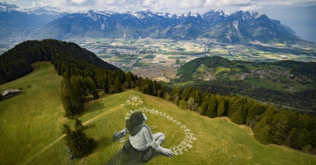 Intitolato "Beyond Crisis" (oltre la crisi) l'affresco - se così si può dire - di 3000 metri quadrati è sorto in territorio di Leysin (VD), su un prato nella zona di Prafandaz, a circa 1500 metri di altitudine.