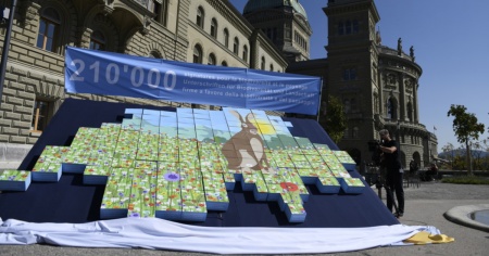 I cartoni con le oltre 213'000 firme complessive raccolte sono stati disposti simbolicamente sulla terrazza di Palazzo federale in una sorta di puzzle simbolico che rappresenta la "Svizzera di domani" colorata e diversificata.