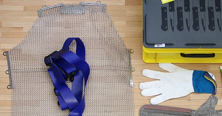 La valigetta contiene guanti anti-taglio, grembiule anti-punta, protezione acustica, occhiali di sicurezza, misuratore, coltello per disossare e crema per mani.