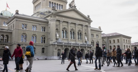 Una catena umana (senza mascherina) davanti a Palazzo federale