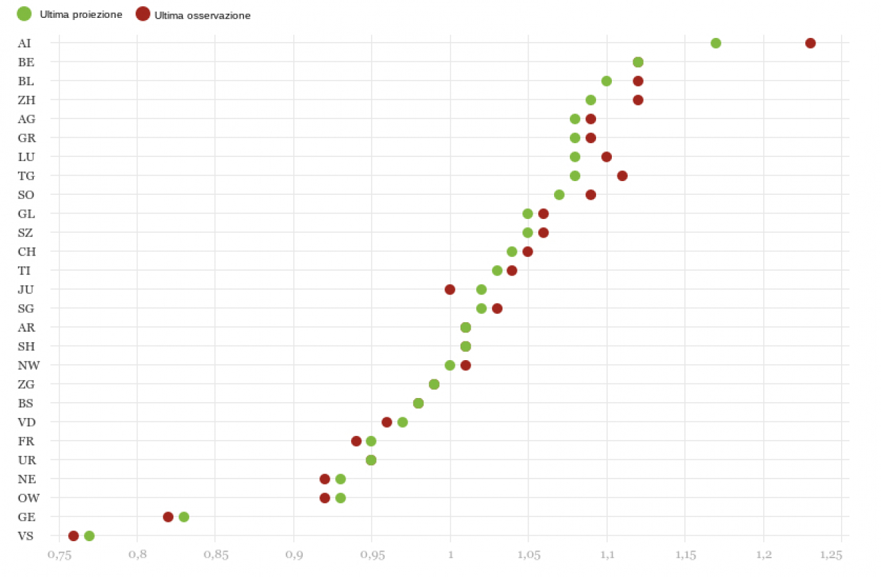A presentare il valore più alto, a sorpresa, è Appenzello Interno con una media dello R0 di 1,23. Si tratta di un valore decisamente particolare e da prendere con le pinze, conferma l'Institute, viste le ridotte dimensioni del cantone in questione. Il Ticino, invece, presenta un R0 mediano, attorno all'1,04.