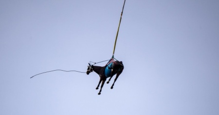 SAIGNELEGIER - Alcuni cavalli hanno ricevuto oggi il loro battesimo dell'aria nelle Franches-Montagnes (JU). Le Forze aeree svizzere hanno effettuato il particolare trasporto in elicottero per allenarsi nell'evacuazione rapida di animali.