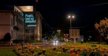 Tra le frasi proiettate sugli stabili si leggeva ad esempio "Stop Single Use, go Reuse" (basta con il monouso, via al riutilizzo) e "Nestlé stop feeding the world with plastic" (Nestlé, smetti di nutrire il mondo con la plastica), ha indicato ieri in tarda serata l'Ong in un comunicato.