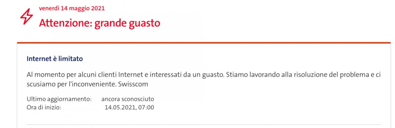 Sulla sua pagina web, Swisscom segnala un «grande guasto». «Stiamo lavorando alla risoluzione del problema e ci scusiamo per l'inconveniente» aggiunge.