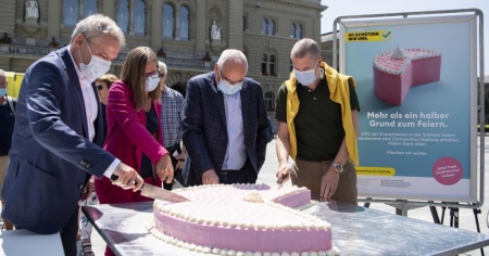 Il dolce, che rappresenta la proporzione delle persone che hanno ricevuto la prima dose, è stato distribuito a Berna.