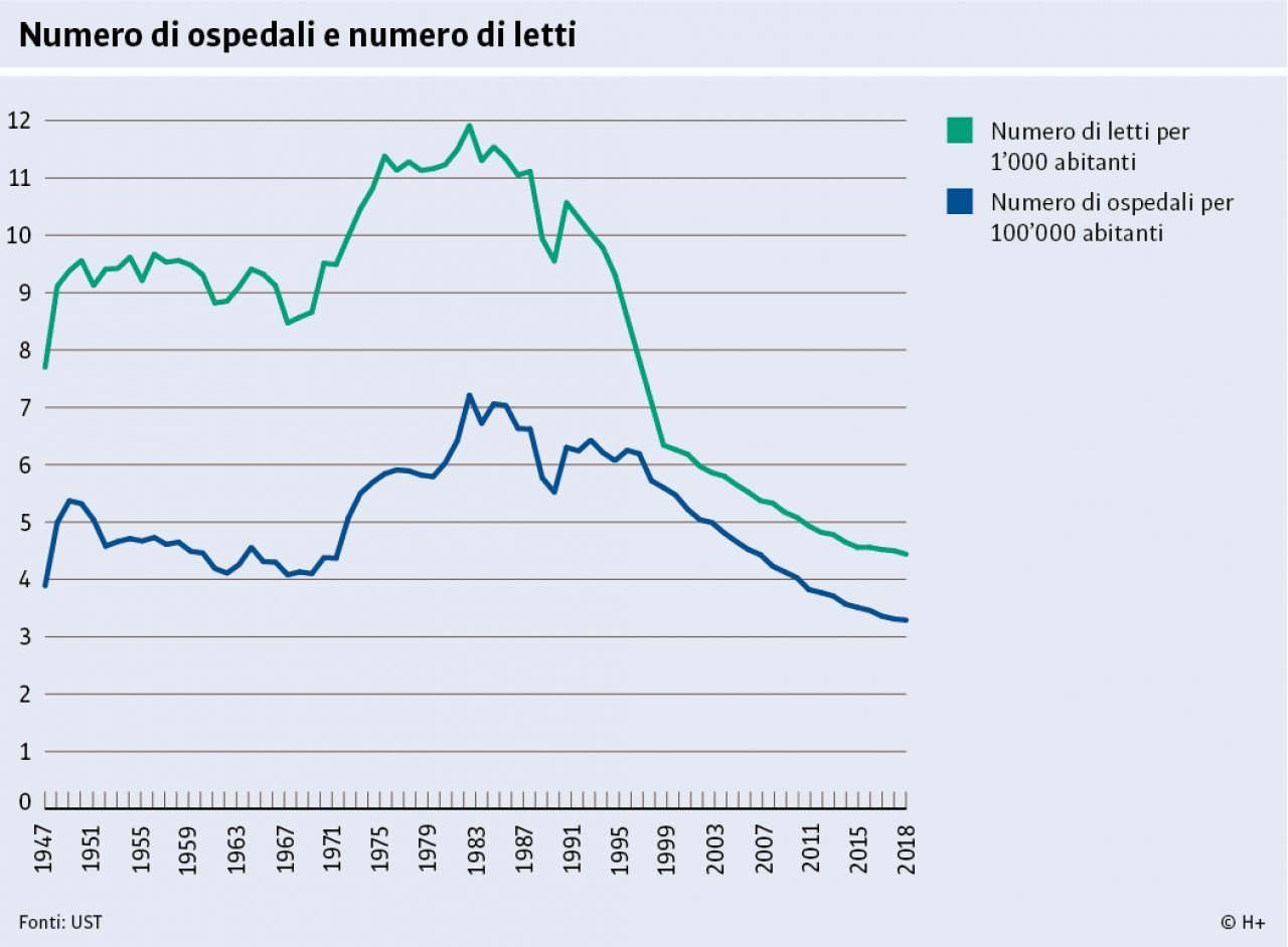 Un taglio netto - I dati dell’Ufficio federale di statistica parlano da sé: negli ultimi vent’anni un letto d’ospedale su sei è stato smantellato. Dagli anni ‘80, gli ospedali in Svizzera sono stati continuamente chiusi, e la capacità dei letti ridotta. Secondo l'associazione H+ Gli Ospedali Svizzeri, nel 2018 il nostro Paese contava ancora 3,3 ospedali ogni 100mila e 4,4 letti ogni 1'000 abitanti. Ciò significa una riduzione del 54% per quanto riguarda le strutture sanitarie e del 63% per i letti, rispetto al culmine del 1982.