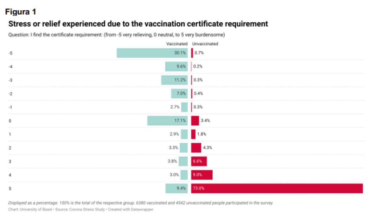 Differenze tra persone vaccinate e non vaccinate - Tra i fattori di tensione correlati alla percezione soggettiva dello stress sono emerse sostanziali differenze tra il gruppo dei vaccinati (58 percento degli intervistati) e il gruppo dei non vaccinati. Le maggiori differenze si riscontrano nelle difficoltà dovute alle misure anti Covid-19 come l’obbligo di certificato, percepito come un peso dalla maggior parte dei non vaccinati e al contrario come un sollievo dalla maggior parte dei vaccinati (figura 1).