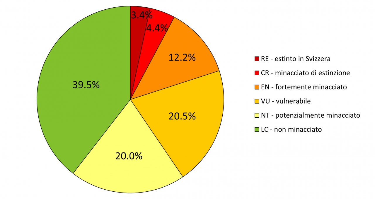Percentuale di specie di uccelli per categoria di minaccia. Solo il 40% circa delle specie di uccelli nidificanti in Svizzera sono considerate "non minacciate".