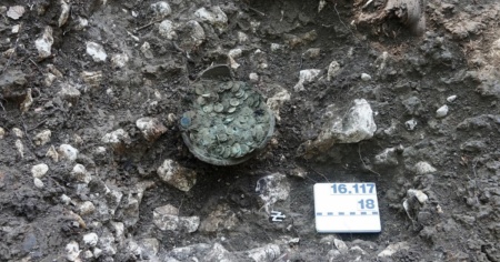 I professionisti sono stati in grado di recuperare il reperto in un unico blocco. Il "tesoro" include 1290 monete tardo romane del IV secolo. Dopo aver esaminato il ritrovamento, gli archeologi sono rimasti doppiamente sorpresi: un pezzo di cuoio divide le monete in due parti, ed è strana l'epoca in cui furono nascoste. Tesori del periodo tra il 332 e il 335 d.C., infatti, sono poco noti.