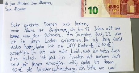 La lettera è scritta in tedesco e racconta di un ragazzino di 12 anni, svizzero. «Il 30 maggio sono entrato nel suo negozio. Siccome non avevo soldi ho rubato un ovetto Joy Kinder. Mi dispiace molto, e so di aver sbagliato. Poiché voglio vivere in pace con Dio e con lei, allego 10 euro per farmi perdonare...».