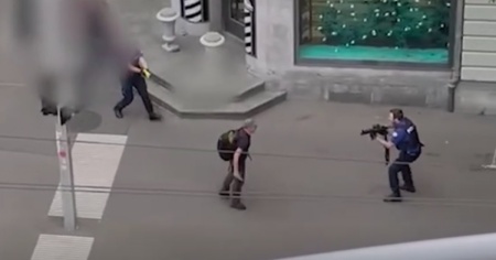 Le immagini catturate da un lettore mostrano l'uomo che si muove velocemente verso un poliziotto armato, urlando frasi incomprensibili. L'aggressore viene immobilizzato da un altro agente, lì presente. Successivamente si sentono ripetute urla di dolore.
