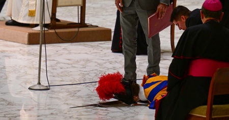 Sono intervenuti gli uomini della sicurezza presenti nella sala e alcuni soccorritori che hanno aiutato il milite a rialzarsi dopo qualche istante salutato da un caloroso applauso dei fedeli.
