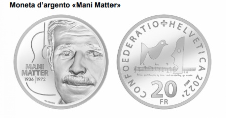 La moneta in argento «Mani Matter» è il primo conio lanciato sotto il nuovo marchio. La moneta, messa in commercio in occasione del 50° anniversario della morte del cantautore, raffigura una parte del volto con i caratteristici baffi e un estratto dell’opera «Dr Alpeflug». A partire da questa edizione, tutte le monete speciali in argento saranno realizzate con un titolo di 999,9 millesimi.