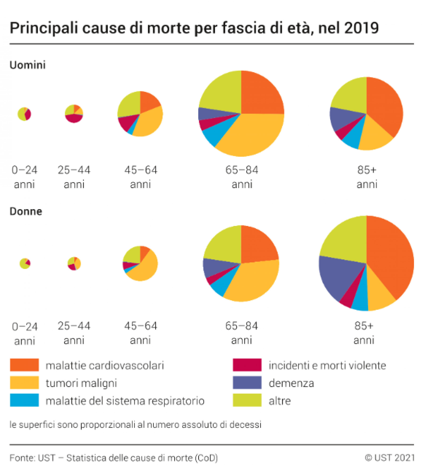 I tumori sono la seconda causa di morte più frequente in Svizzera. È però la prima tra i 45 e gli 84 anni, nel caso degli uomini, e tra i 25 e gli 84 anni per le donne.