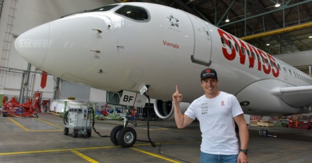 L'Airbus A220-100, immatricolato HB-JBF, è stato battezzato oggi all'aeroporto di Zurigo e ha avuto un padrino d'eccezione: lo sciatore grigionese Gino Caviezel. Il velivolo ha in seguito effettuato il suo volo inaugurale diretto a Dresdsa.