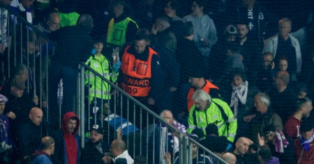 L'arbitro è stato convinto a interrompere la partita grazie ai tifosi del settore ospiti. Paramedici e altri giocatori si sono precipitati rapidamente verso quella zona degli spalti. La notizia si è diffusa a macchia d'olio e lo speaker l'ha confermato poco dopo: un tifoso dei "Viola" è crollato a terra in seguito a un malore.