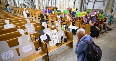 Nella fila di destra, attivisti e sostenitori reggevano cartelli colorati con i nomi, le età e i Paesi di provenienza dei richiedenti asilo respinti e minacciati di espulsione. L'azione si è svolta pacificamente per un'ora, con una presenza discreta della polizia all'esterno e poi all'interno della cattedrale.