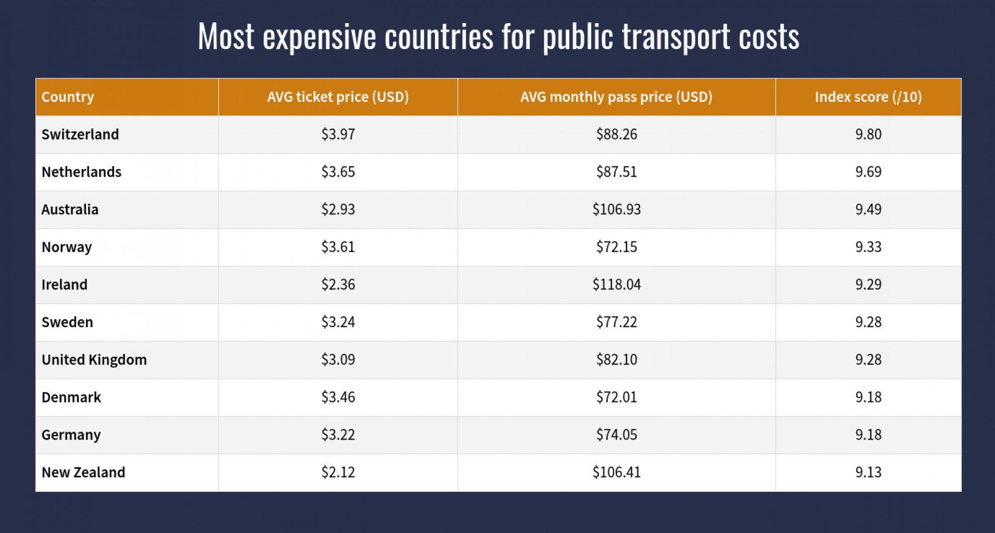 Al secondo posto troviamo invece i Paesi Bassi, con una tariffa media per un biglietto adulti di sola andata equivalente a 3,33 franchi svizzeri e un abbonamento mensile di 79,81 franchi, seguiti dall’Australia, con un biglietto sola andata da 2,67 franchi e un abbonamento mensile medio da 98,40 franchi. Completano la Top 10 dei Paesi con i mezzi pubblici più costosi Norvegia, Irlanda, Svezia, Regno Unito, Danimarca, Germania e Nuova Zelanda.