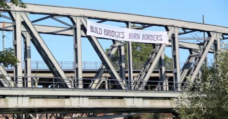 Sei persone si sono calate e hanno attaccato due striscioni sul Dreirosenbrücke. La polizia per evitare ferimenti ha interrotto il transito.