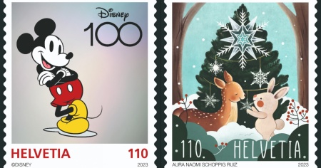 BERNA - Anche la Posta svizzera si unisce al coro della celebrazione per il centennale della Disney con due francobolli a tema dedicati a Topolino e a Minni.È invece a tema Natale il nuovo set da 5 francobolli, realizzati in collaborazione con l'art...