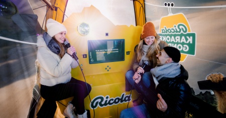 Le gondole karaoke Ricola stanno girando sulla linea Grindelwald-Männlichen per tutta la stagione invernale. Ogni gondola karaoke può ospitare otto persone e il viaggio dura 20 minuti. I passeggeri delle gondole karaoke Ricola possono immortalare la loro esperienza unica con una fotocamera integrata e condividerla con i loro amici.