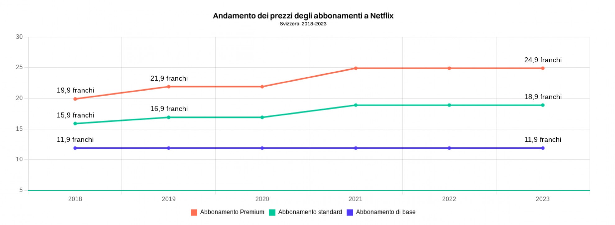 Confrontando i prezzi dei tre abbonamenti proposti dalla piattaforma si nota che: il prezzo di 11,9 franchi per l'abbonamento di base è rimasto invariato negli ultimi 5 anni; l'abbonamento standard, invece, costa 3 franchi in più rispetto al 2018, ossia 18,9 franchi. Il prezzo dell'abbonamento premium, infine, è aumentato di 4 franchi in 5 anni.